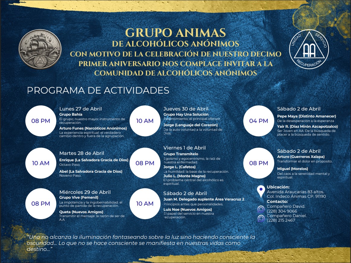 Ésta es la fecha en que oficialmente se funda Alcohólicos Anónimos y a partir de la cual comienza a desarrollarse el revolucionario y exitoso programa de los “Doce Pasos de A.A.” que ayuda a los alcohólicos a mantenerse en sobriedad. El nombre de A.A. es tomado de la primera publicación del libro “Alcohólicos Anónimos” en el año de 1939 escrito por Bill W.