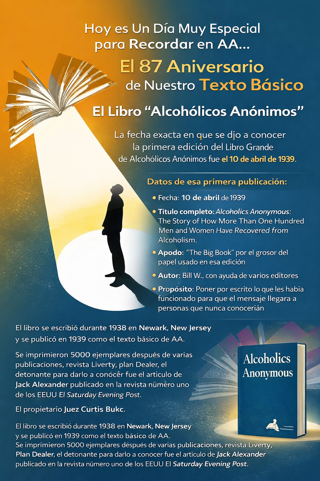 Ésta es la fecha en que oficialmente se funda Alcohólicos Anónimos y a partir de la cual comienza a desarrollarse el revolucionario y exitoso programa de los “Doce Pasos de A.A.” que ayuda a los alcohólicos a mantenerse en sobriedad. El nombre de A.A. es tomado de la primera publicación del libro “Alcohólicos Anónimos” en el año de 1939 escrito por Bill W.