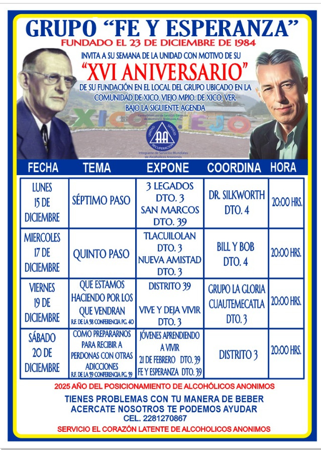 Ésta es la fecha en que oficialmente se funda Alcohólicos Anónimos y a partir de la cual comienza a desarrollarse el revolucionario y exitoso programa de los “Doce Pasos de A.A.” que ayuda a los alcohólicos a mantenerse en sobriedad. El nombre de A.A. es tomado de la primera publicación del libro “Alcohólicos Anónimos” en el año de 1939 escrito por Bill W.