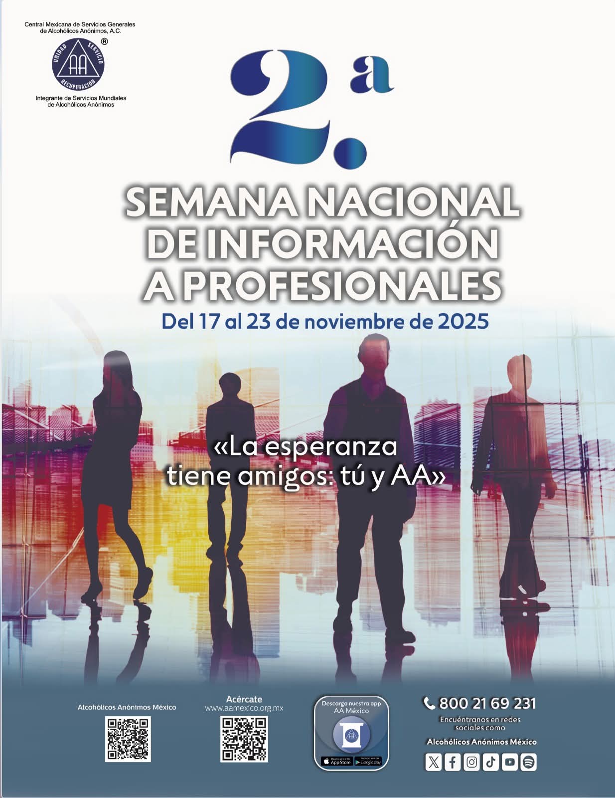 Si usted es un profesional de las áreas de la salud, educación, justicia, ámbitos religiosos o empleador de recursos humanos y desea recibir mayores informes sobre el funcionamiento de Alcohólicos Anónimos y su programa de recuperación, puede ponerse en contacto con nosotros a través del siguiente correo: Esta dirección de correo electrónico está siendo protegida contra los robots de spam. Necesita tener JavaScript habilitado para poder verlo........