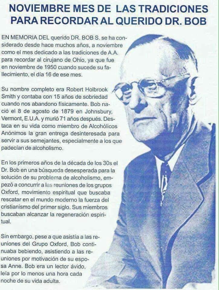 Alcohólicos Anónimos nace un 10 de junio de 1935 en la ciudad de Akron, Ohio en los Estados Unidos de América, cuando dos alcohólicos crónicos: el Dr. Robert H. Smith (Bob S.) y William Griffith Wilson (Bill W.) – cofundadores –, se encuentran y a través del compartimiento de sus experiencias como bebedores problema alcanzan el estado de sobriedad permanente. El éxito de este resultado es basado en la idea de que un alcohólico puede ayudar a otro alcohólico a través de un “puente de comprensión”.